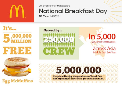 National Breakfast Day is a regional McDonald’s initiative, a total of more than 100,000 free Egg McMuffins will be given out island-wide, and a total of some five million Egg McMuffins will be given away in Asia, the Middle East and Africa – hoping to help the people to start on a good breakfast habit.