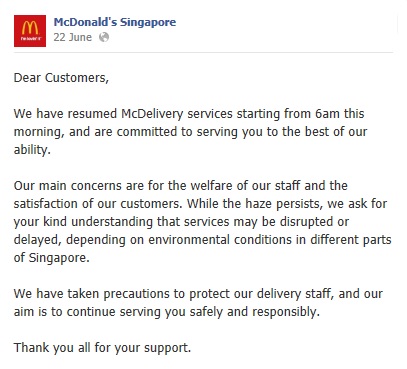 On top of this, McDelivery service has assumed as long as the haze do not get worsen. ^_^