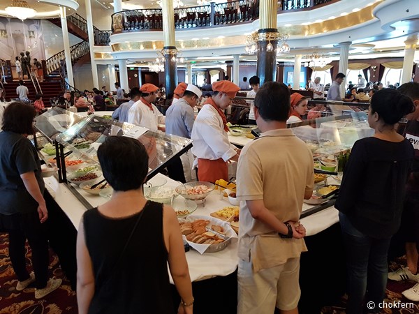 Ever since the “not-so-relax” experience in Windjammer, we decided that Main dining room (Rhapsody in Blue@Deck3) will be a better place for meals with Kpo Kia. We are fine with limited choice of food, but with Kpo Kia along, we just want to eat at a rest and relax pace. Here we will get a comfortable seating, without pressure to give out our seats, and the servers are friendly, or at least polite.