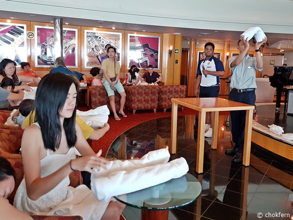 After our breakfast, we had initially wanted to attend the Origami Class at Schooner Bar, but apparently we reached there too late,thus we only get to see a short few minutes of the last demonstration…. Thanks to the whiny Kpo Kia who decided to make a poo cake for us, set us on first level emergency to rush her back to our room to change her diaper. =.=” But I really got to admit that my friend’s recommendation to bring a young kid to cruise for tour is a good idea, the ‘changing room'(our room!) is always just a lift (and some walking) away.